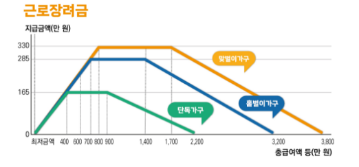 최대로 받을 수 있는 부관은 단독 가구는 연소득이 400만 원에서 900만 원 사2일 때 최대 금액인 165만 원을 수령하고 콧벌이 가구는 700만 원에서 1400만 원 사2일 때 285만 원 맞벌이 타구는 800만 원에서 1700만 원일 경우 최대치인 330만 원을 수령할 수 있습니다. 오늘은 일하는 분들을 위한 정부 지원금에 대해 알아보았는데요. 신청자의 소득에 따라 누가 신청해야 가장 많이 받을 수 있는지 계산하셔서 더 많은 지원금을 받아보시기 바랍니다.
