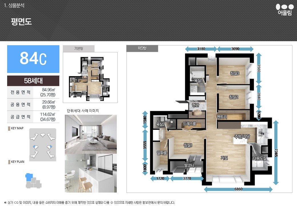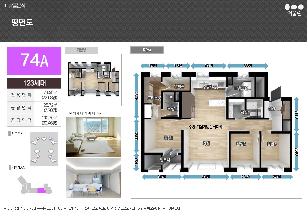 구조를 보면 3 ROOM,2 BATH,1 LIVING 구조로 인기 많은74 타입, 84 타입을 가지고 있으며