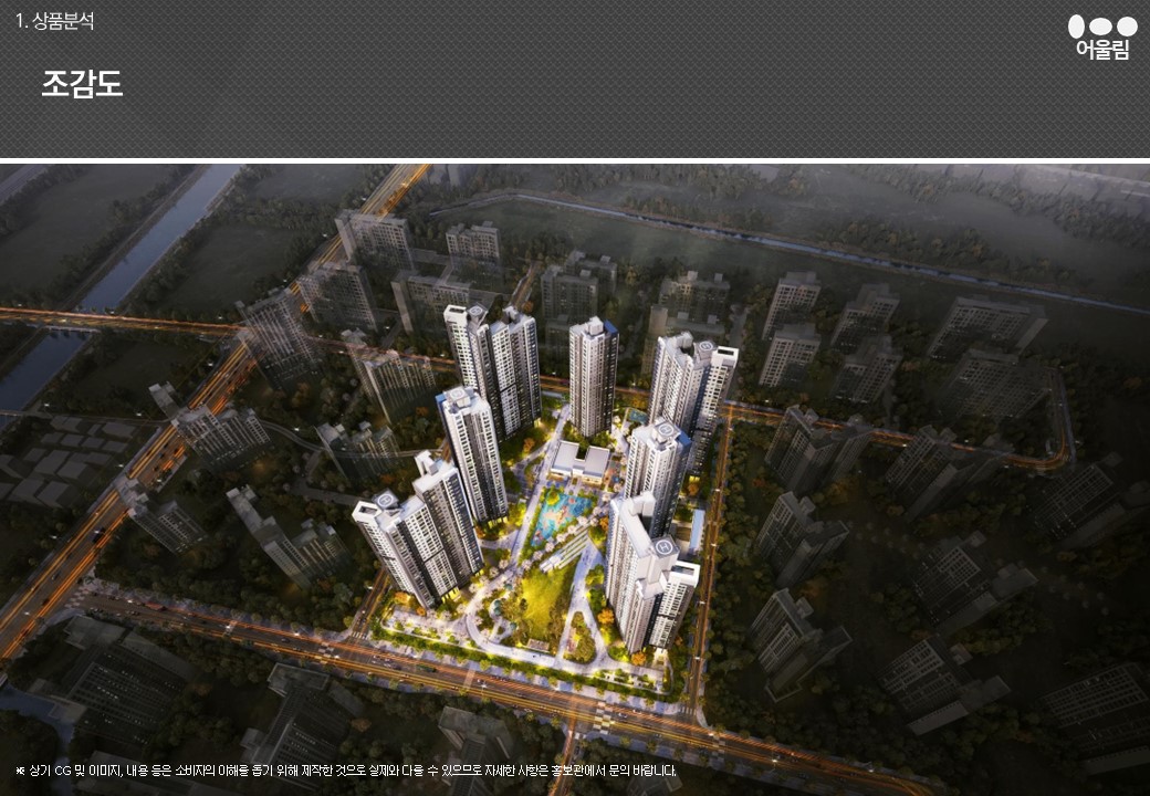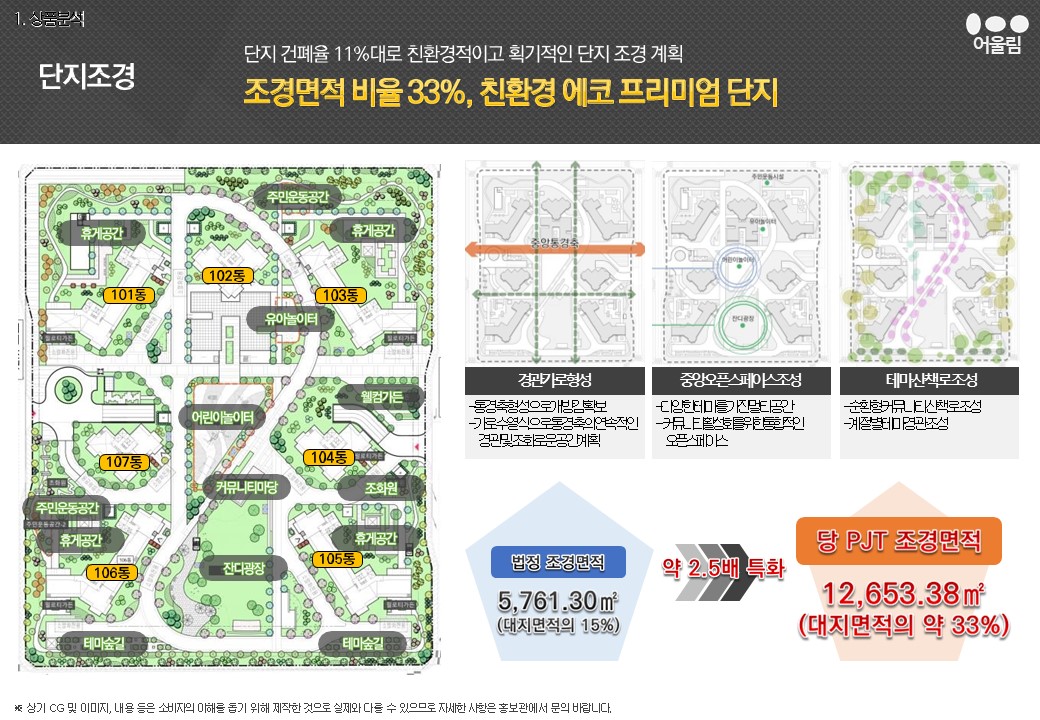 이렇게 낮은 건폐율을 바탕으로 건물사이는 녹지, 여가 시설 등 조경 면적을 약 38% 비율로 채워 쾌적성 증진은 물론 세대 간의 마찰이나 소음을 완화하고 동시에 일조와 조망권을 확보하였습니다.
