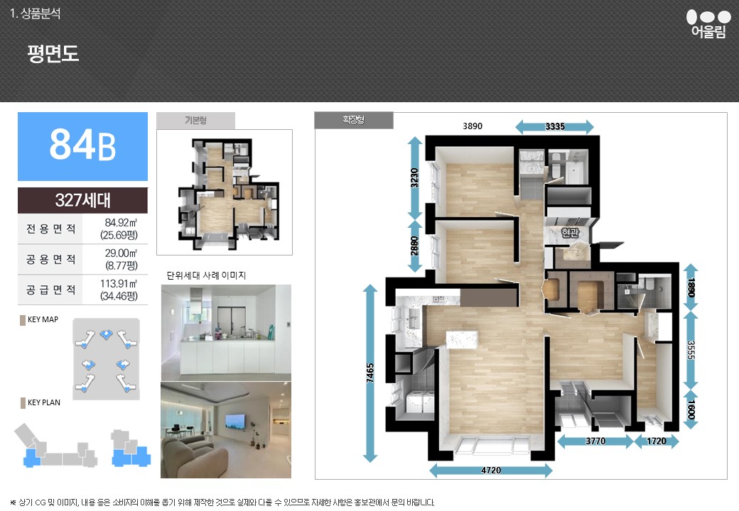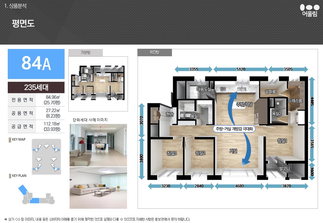 84A 는 알파룸과 현관창고를 제공하여 공간 활용도를 높이고 11자형 주방으로 이동의 효율성을 제고합니다.