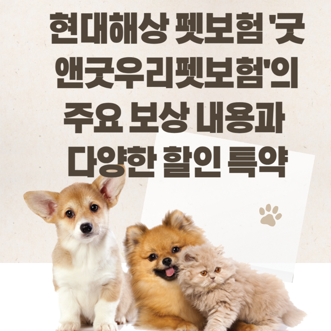 현대해상의 '굿앤굿우리펫보험'은 반려동물의 건강을 보호하기 위한 필수적인 선택지로, 갑작스러운 의료비 걱정을 덜어줄 뿐만 아니라, 다양한 보장 옵션과 할인 혜택을 통해 보호의 범위를 넓혀줍니다.