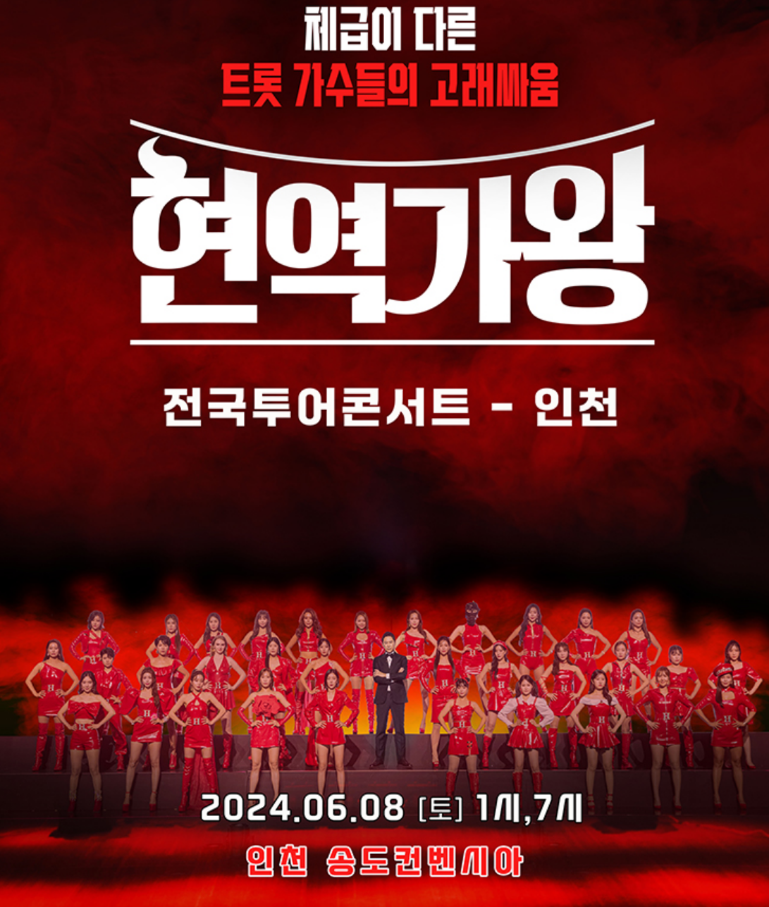 2024년 06월 08일 토요일 오후 1시 1회차, 오후 7시 2회차 인천 송도컨벤시아에서 2024 혁역가왕 전국투어 콘서트 전주 콘서트에 이어 현역가왕 TOP7을 인천에서 다시 만나 보실 수 있습니다.